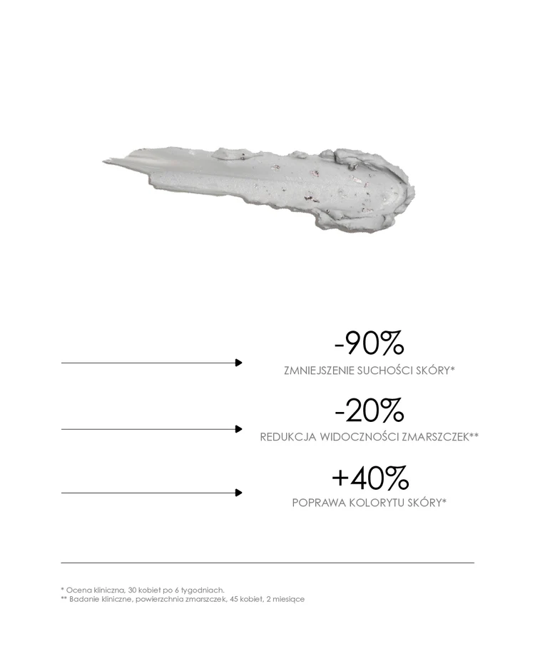 Zapewnia natychmiastowe nawilżenie i wygładzenie. Redukuje zmarszczki oraz poprawia elastyczność skóry. Chroni przed stresem oksydacyjnym i wspiera regenerację.